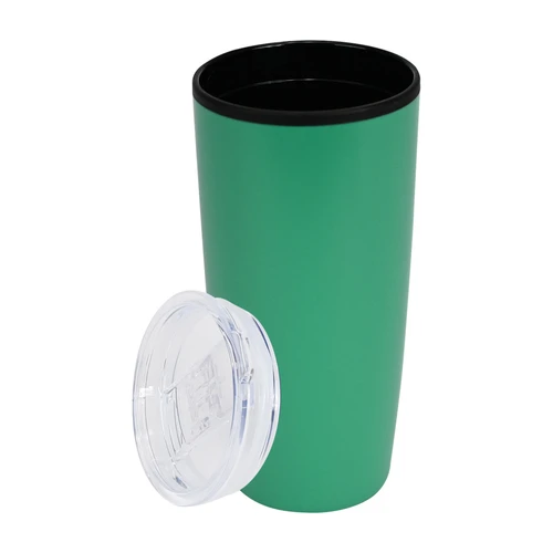 Mug metálico doble pared aislante, interior plástico PP, exterior Acero inoxidable 201 SS, recubierto con pintura POWDER COAT, modelo "LOFT". Producto BPA FREE, para el contacto con líquidos y alimentos. Fondo de silicona negra ABS anti-deslizante. Tapa removible de plástico PS Crystal Clear con sello cilíndrico de silicona. Capacidad 600ml. Presentación en bolsa PP + caja de regalo de cartón negro.