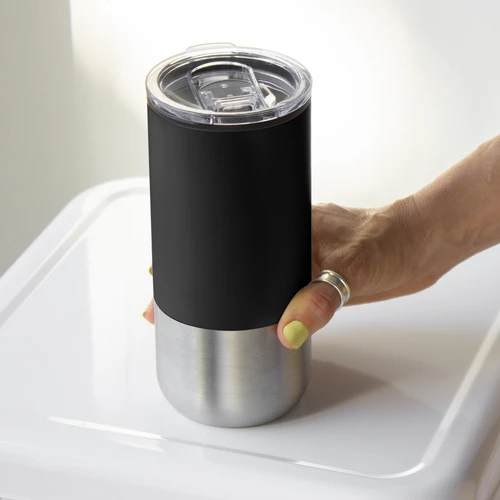 Ø 8 cm X 17.6 cm. Capacidad 500 ml. Polipropileno y acero inoxidable. Mug doble pared. Interior en plástico y exterior de acero inoxidable 201. Tapa plástica transparente a presión con anillo de silicona. Base antideslizante. Presentación en caja de regalo.