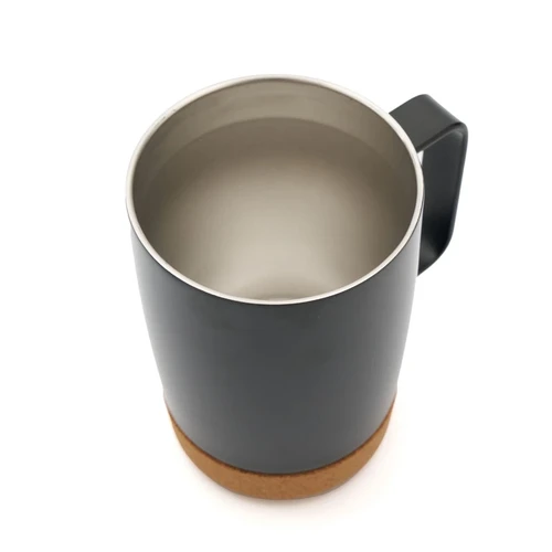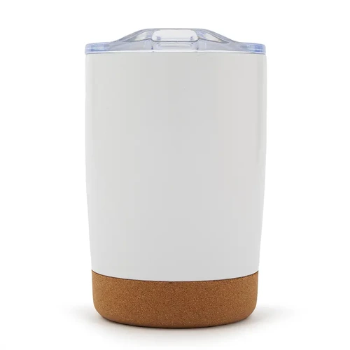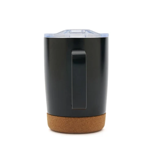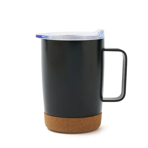 Mug de 350 ml. Con su diseño de doble pared y base de corcho, mantiene la temperatura de tus bebidas por más tiempo, mientras que su tapa anti derrame ofrece una mayor comodidad y seguridad en el uso diario. Además, cuenta con una manija ergonómica que facilita el agarre y el transporte.