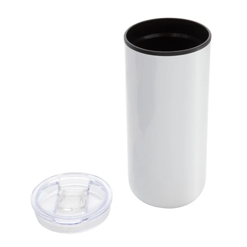 Lleva tus bebidas con estilo y sin derrames.Mug doble pared. Interior en plástico y exterior de acero inoxidable 201. Tapa plástica transparente a presión con anillo de silicona. Base antideslizante. Medidas: Ø 8 cm x 17.6 cm.