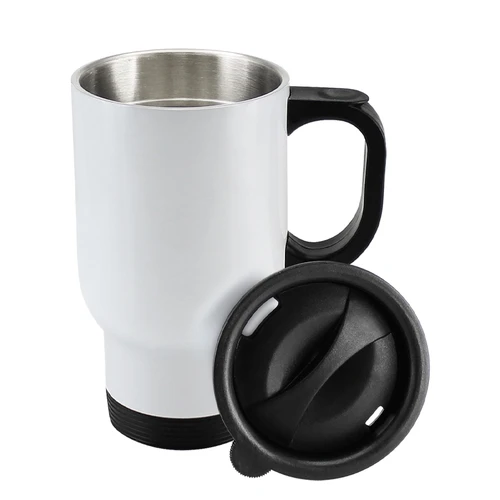 Mug Térmico Blanco de doble pared aislante, interior de acero inoxidable. Tapa, asa y base plástico negro. Cobertura exterior con polímero especial marca ORCA COATINGS(R) para una sublimación de primera calidad. Cada unidad se entrega dentro de su caja individual de cartón blanco.