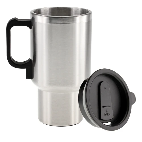Mug térmico de acero inoxidable de doble pared aislante con tapa plástica negra y dosificador. Con conector USB y al cenicero del automóvil. Presentación en caja de cartón plateado.