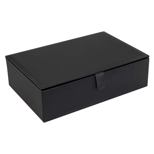 Set Multijuegos en caja grande de PU negro, con tapa con hebilla cierre magnético. Incluye 4 cachos de PU, 20 dados, 2 naipes ingleses y dominó grande.