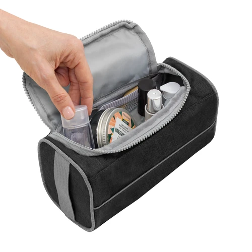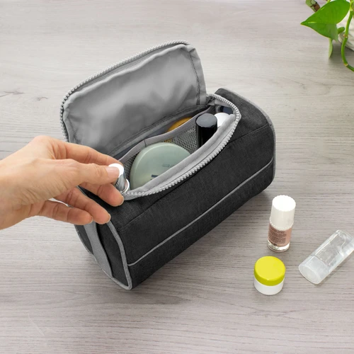 Diseño compacto, practicidad en tus manosNecessaire con tapa. Organizador con dos bolsillos internos de red elastizados, tapa acolchada con cierre plástico color gris y asa lateral de tela color gris para transportar.Medidas:22 x 10 x 12 cm.