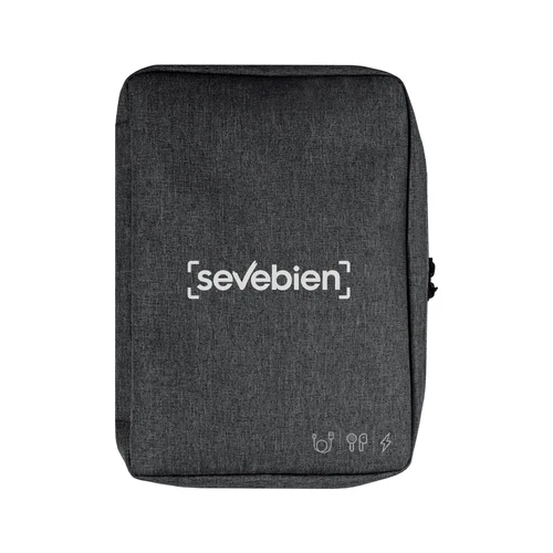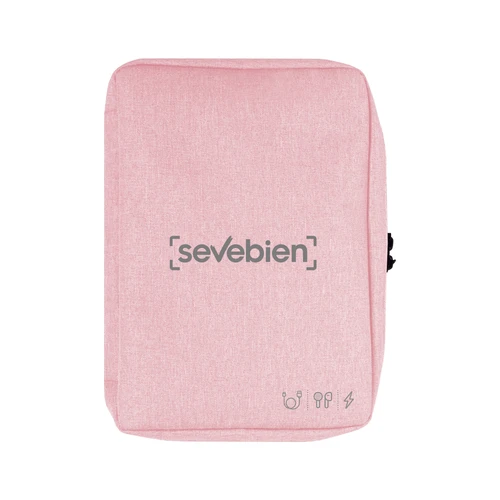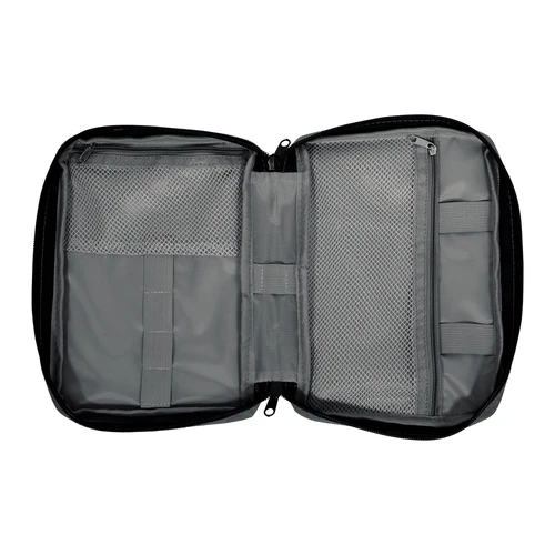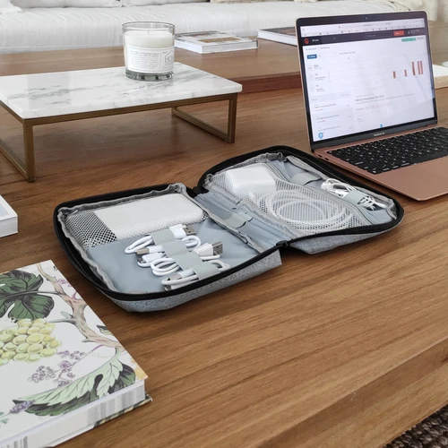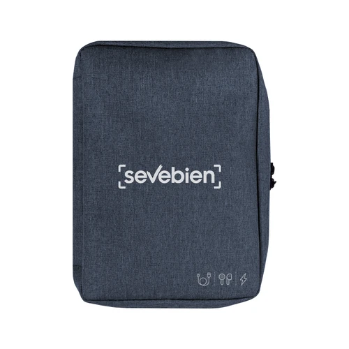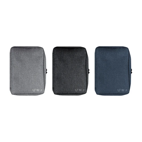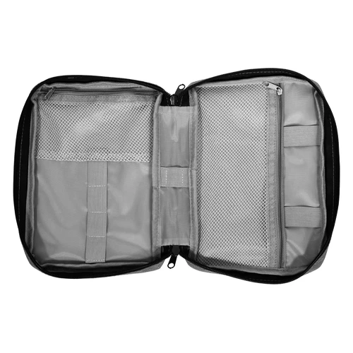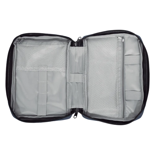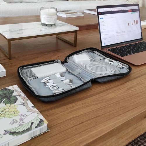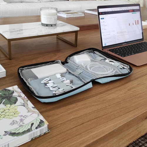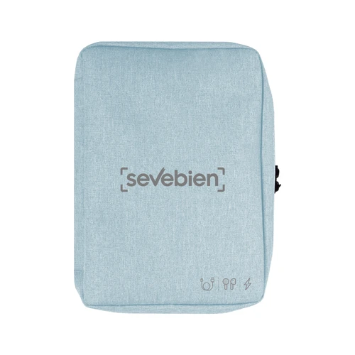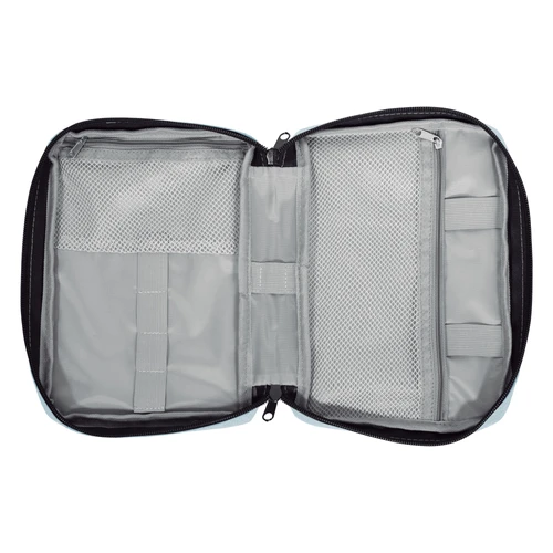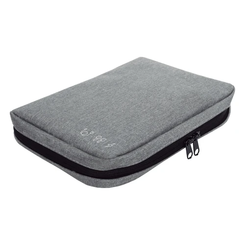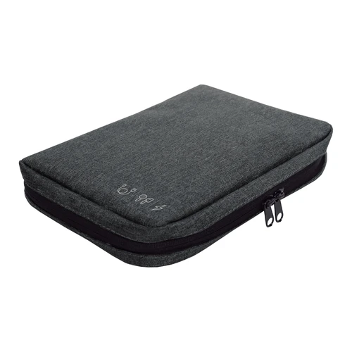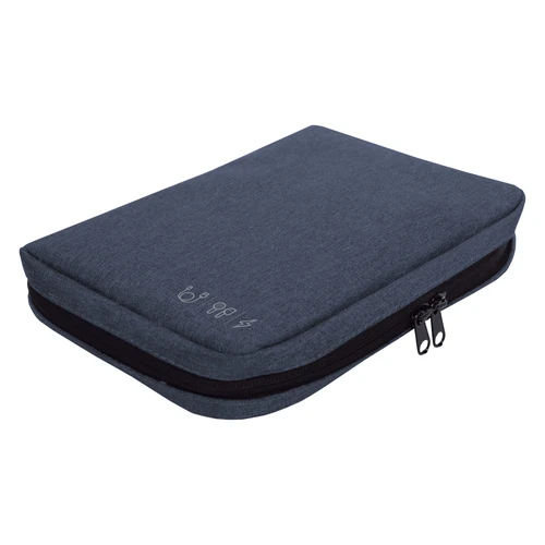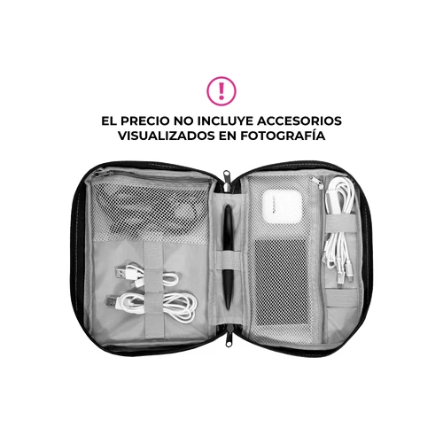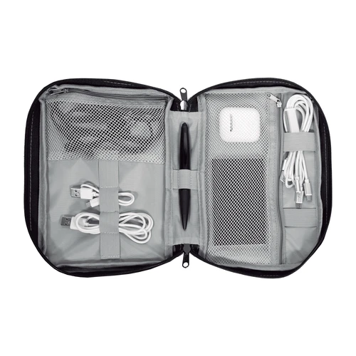 16,5 x 23 x 4 cm.Poliéster. Organizador para cables y accesorios. Cuenta con dos bolsillos de red con cierre. 4 elásticos que permiten arrollar y guardar los cables, 1 elástico porta bolígrafo y 2 elásticos amplios. NO INCLUYE ACCESORIOS.