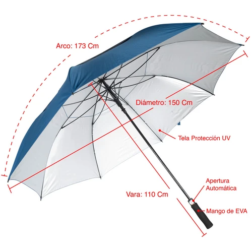 Paraguas gigante de Golf, con 8 cascos de tela 190T PONGEE, reverso UV. Incluye doble casco WINDPROOF (grande y pequeño), que evita el volcamiento ya que permite que el viento pase entre los cascos. Contiene varas reforzadas Anti-Vuelco de Fibra de Vidrio color negro y sistema de apertura automático. Mango recto de EVA negro. Incluye funda al tono de 190T PONGEE.