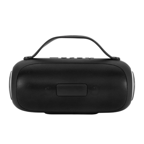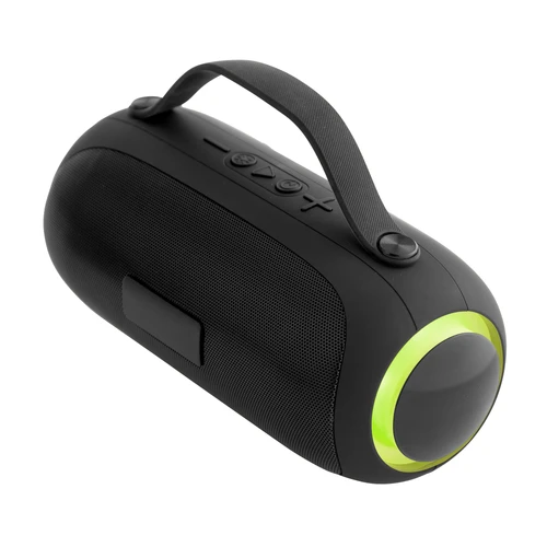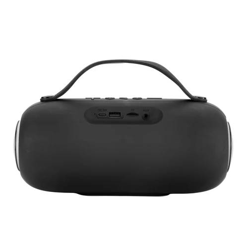 Potencia para animar cualquier momento.Subwoofer, altavoz de frecuencias graves. Luz led en sus laterales con 7 combinaciones de transición multicolor. Malla metálica con placa independiente. Estructura plástica con textura suave al tacto. Correa de silicona color negro. Ranura para tarjeta SD y conector AUX. Incluye manual de uso. Cable de carga USB-C / DC5V de 80 cm color negro. Base antideslizante.Medidas: Ø 9,5 x 23 x 14 cm.
