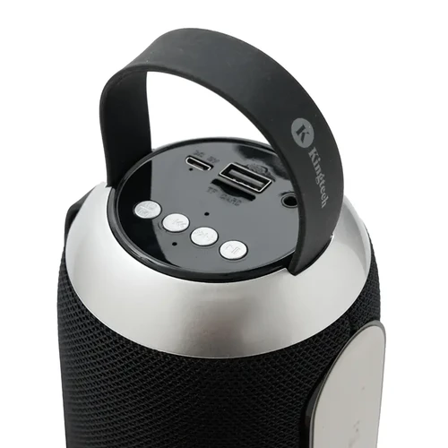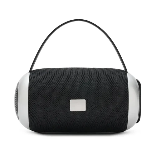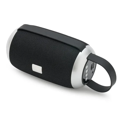 Parlante portátil Bluetooth de color negro con detalles en gris. Cuenta con una correa de agarre y una base que proporciona un mejor apoyo y estabilidad al usarlo en diversas superficies.
