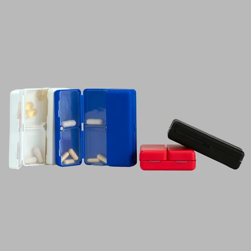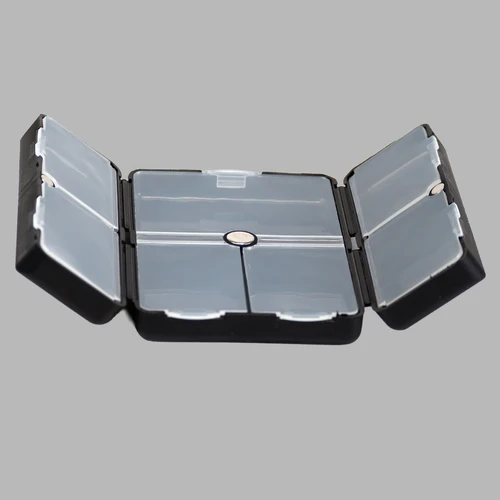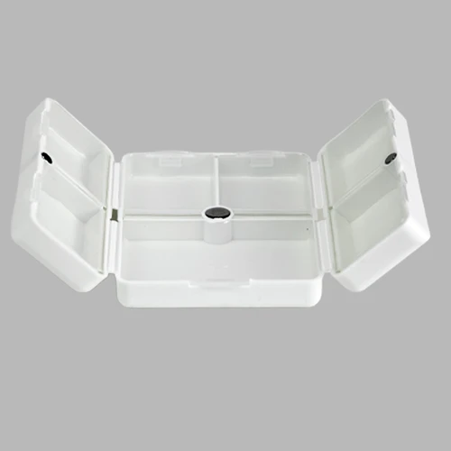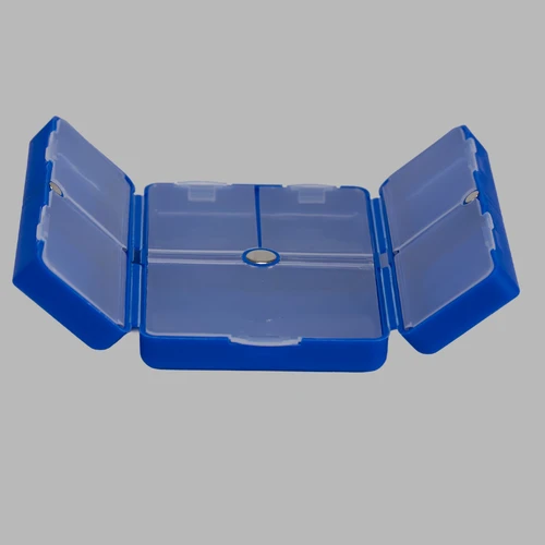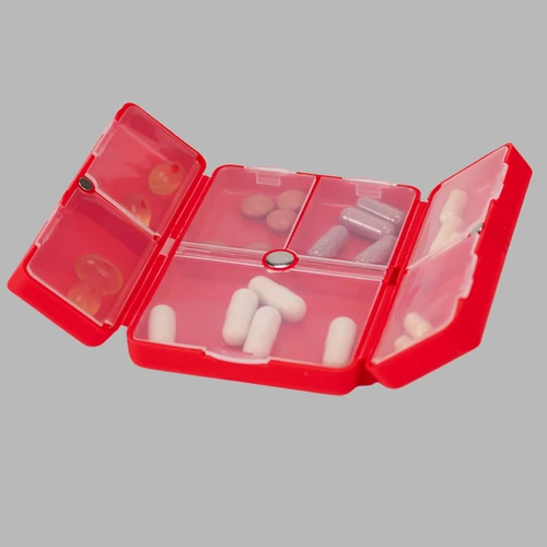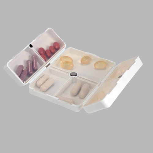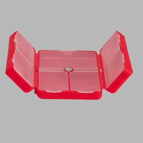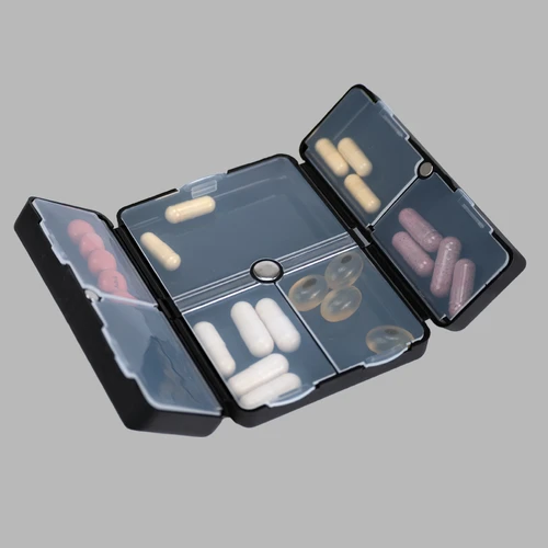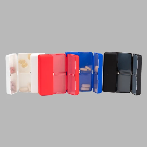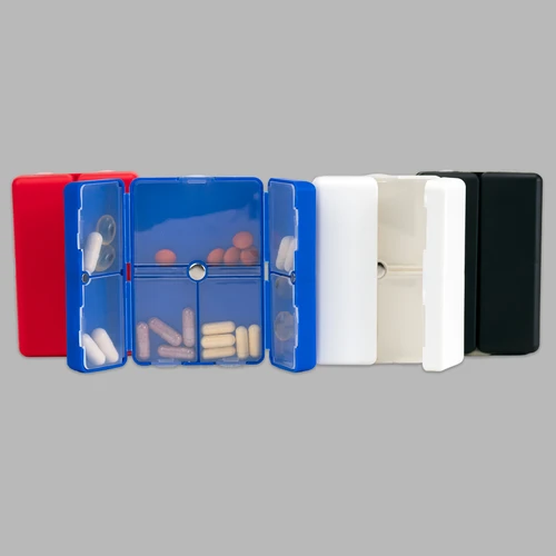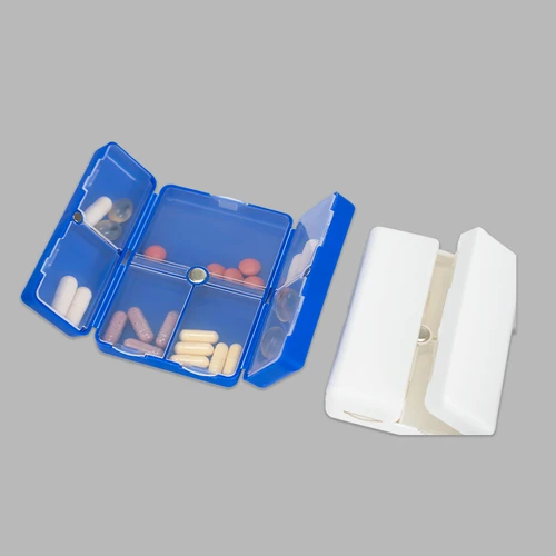 Pastillero semanal "CARE" de Polipropileno (PP). Cuenta con 7 compartimentos interiores de PVC translúcido y apertura doble tipo "libro", con cierre interior imantado. Presentación el bolsa OPP + caja de cartulina blanca.