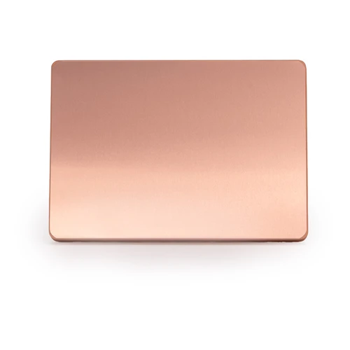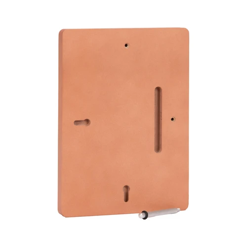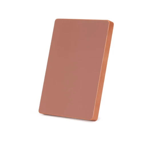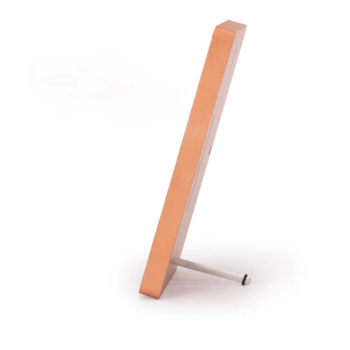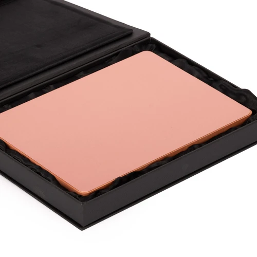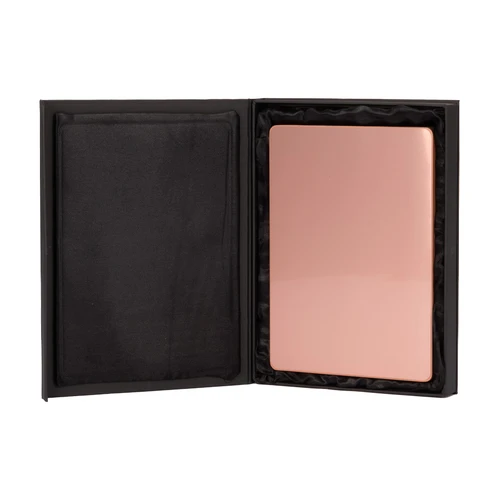 Placa metálica color cobre, modelo "BLOCK", montada sobre base rectangular de madera enchapada con esquinas redondeadas. En su parte posterior, incluye orificios y soporte metálico para exhibición vertical u horizontal. Presentación en caja de cartón forrado negro con cierre imantado, interior acolchado de espuma y tela poliéster satinado negro, con troquel. OJO: la placa metálica viene con film plástico removible, para protección de la misma.