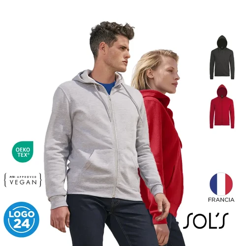 Polerón de frisa 50% algodón y 50% poliéster de 260g con cierre y capucha unisex.