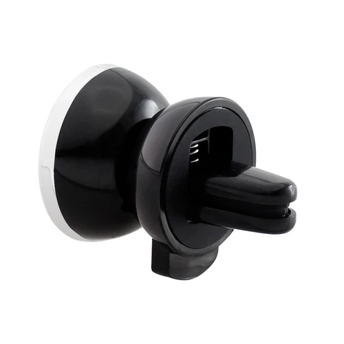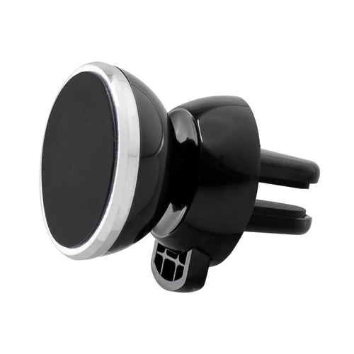 Porta-Celular magnético, con soporte para rejilla de ventilador del vehículo. Contiene placa redonda metálica con adhesivo posterior, para pegar a los celulares (más antiguos) que no cuentan con material magnético built-in. Esta placa redonda se puede grabar, previamente a ser pegada en el celular.