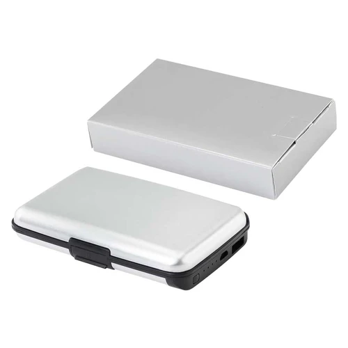 Estuche rígido Porta-Tarjetas (tamaño Tarjeta de Crédito) con protección anti-clonación o Escaneo RFID. Capacidad interior para 6 Tarjetas. Incluye cargador de celular Power Bank de 2.500 mAh, con indicador de carga y cable USB/Micro USB. Presentación en bolsa de polipropileno y Estuche plateado de Regalo.