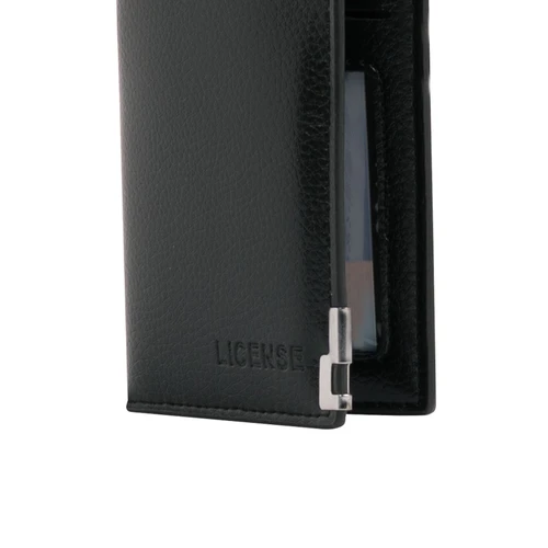 Billetera portas-tarjetas de eco-cuero negro, formato vertical, modelo "LICENSE". Contiene 8 compartimentos interiores. Presentación en bolsa frozen y caja de cartón forrado negro opaco.