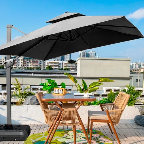 Quitasol lateral cuadrado de 3x3m, con 4 cascos de resistente lona Poliéster impermeable de 260g con protección UV. Contiene asta de Aluminio de 90x60mm x 2.50m de altura y 8 varas de aluminio. Sistema de apertura manual con regulación de altura y ángulo para sombra. Sistema manual de rotación 360°. Puedes usarlo en la noche! Cuenta con panel de carga solar y sistema de iluminación LED sectorizado, con interruptor.