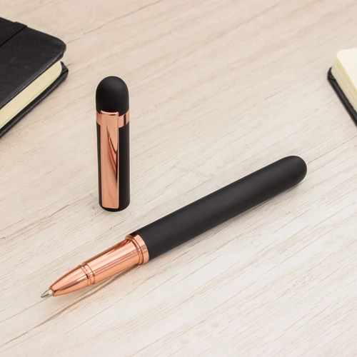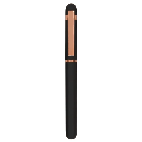 Metal. Cuerpo de aluminio, acabado engomado color negro, muy suave al tacto. Roller. Apertura con tapa a presión. Clip y anillos metálicos color cobre. Tinta Azul. Decapa cobre tanto en el cuerpo como en la tapa (grabado exclusivo en nuestro taller). Presentación en caja de regalo.