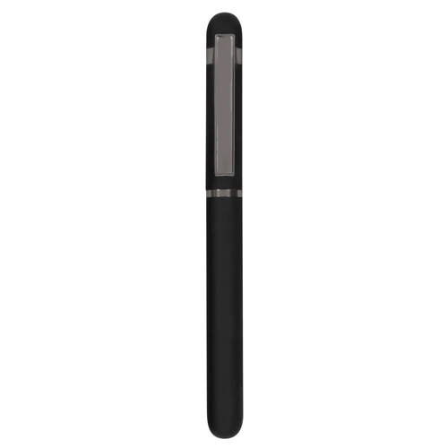 Metal. Cuerpo de aluminio. Roller. Apertura con tapa a presión. Clip y anillos metálicos color plata. Tinta Negra. Destape electroplateado en ambas partes. Presentación en estuche con cierre magnético.
