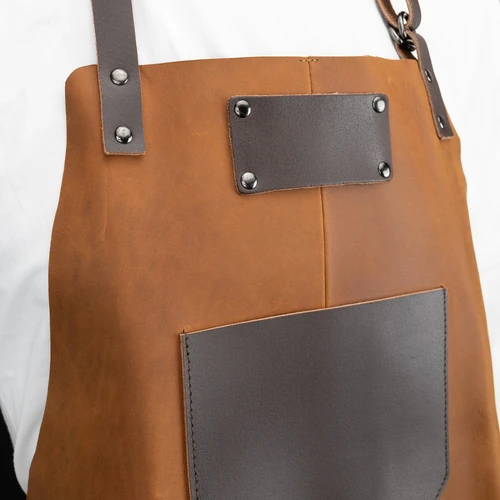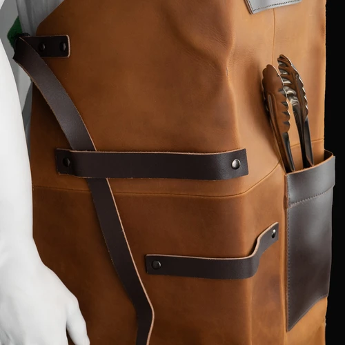Un regalo fuera de serie. Deluxe set de Asador, contiene Pechera de Asador BBQ en cuero curtido, envejecido y suavizado 100% genuino color café cognac, con cintas y porta-accesorios de Cuero 100% genuino color café oscuro. Remaches de acero envejecido y 2 bolsillos delanteros de 22 x 18 cm. y 18 x 14 cm. Rectángulo para logo de 10 x 5 cm. Contiene además largo mitón de Asador BBQ en cuero curtido, envejecido y suavisado 100% genuino color café cognac y tenazas de Acero inoxidable. Presentación en elegante caja de regalo de cartón negro con ventana de mica transparente y gráfica a todo color con descripción de los elementos del set.