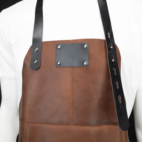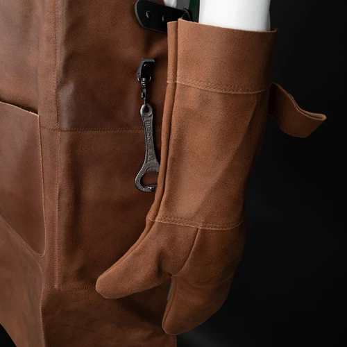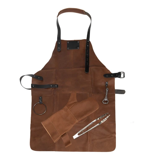 Un regalo fuera de serie. Deluxe set de Asador, contiene Pechera de Asador BBQ en Cuero engamuzado 100% genuino color café cognac, con cintas y rectángulo de 8 x 5 cm. de Cuero 100% genuino color negro. Argolla, destapador y remaches de acero envejecido y bolsillo delantero de 20 x 21 cm. Contiene además largo mitón de Asador BBQ en Cuero engamuzado 100% genuino color café cognac y tenazas de Acero inoxidable. Presentación en elegante caja de regalo de cartón negro con ventana de mica transparente y gráfica a todo color con descripción de los elementos del set.