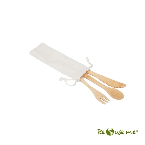 Set de Cubiertos reutilizables de Bamboo con funda de tela. Incluye cuchillo, tenedor y cuchara. Medidas: 22 x 7 cm. ReUseMe