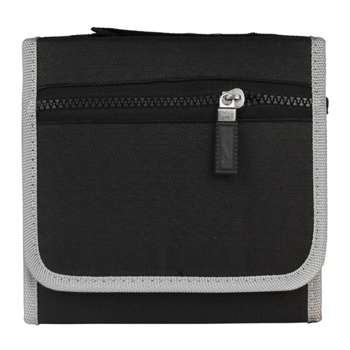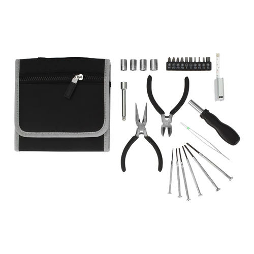 Set de 26 prácticas herramientas en Estuche plegable de tela raquelada negra.