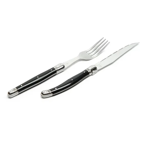Set de 8 cubiertos, incluye 4 cuchillos y 4 tenedores. Hojas de acero forjado 420 y mango ABS con detalles metálicos. Medidas de la caja: 28cm x 18cm x 3cm. Producto libre de BPA. Laguiole.