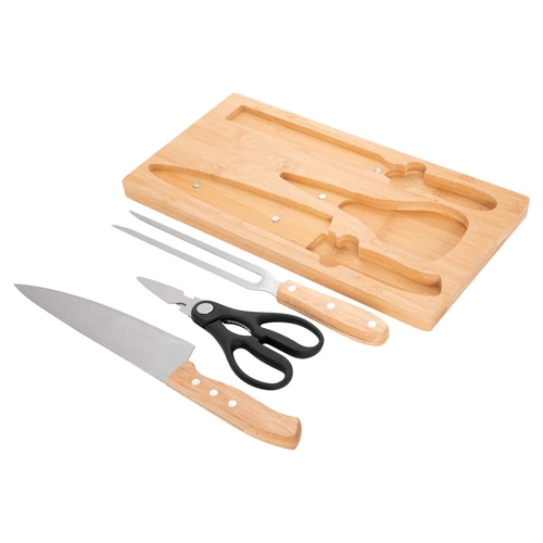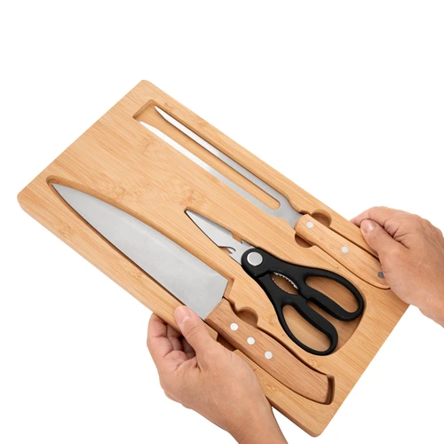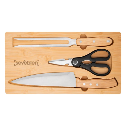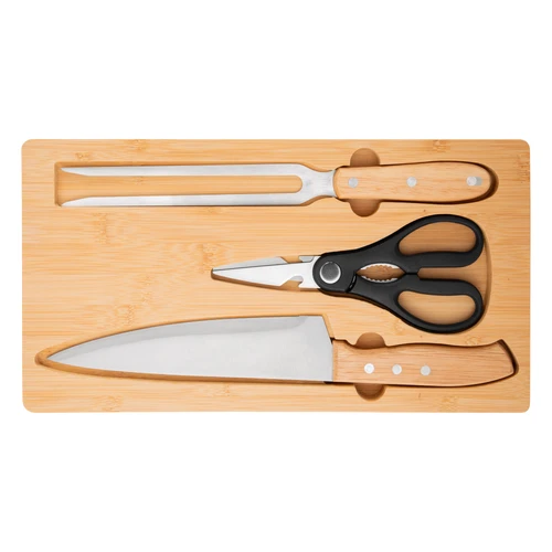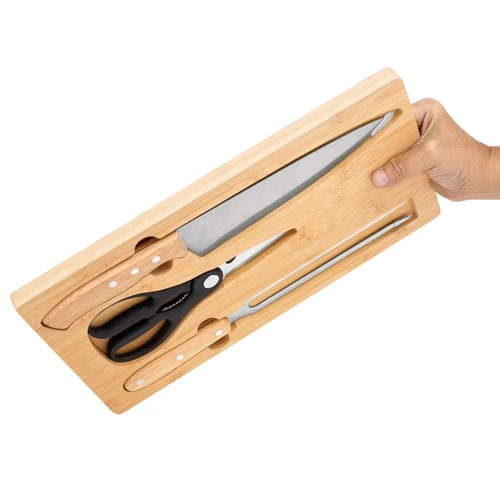 El detalle que se luce en cada asadoSet de asado. Tabla de corte de bambú con imán en el lado opuesto para fijar los 3 utensilios: Tijera de cocina multiuso (corte de aves, pescados, vegetales, y hierbas con abridor de botellas y rompenueces) de acero con mango plástico; Cuchillo chef y Tenedor, ambos de acero con mango de madera. Medidas: 36 x 19.4 x 1.8 cm. (tabla), 19,5 x 8,5 cm. (tijera), 33,5 x 4,5 cm. (cuchillo) y 30,5 x 3 cm. (tenedor)