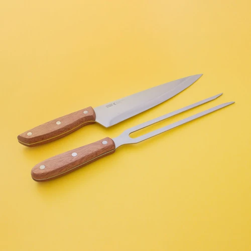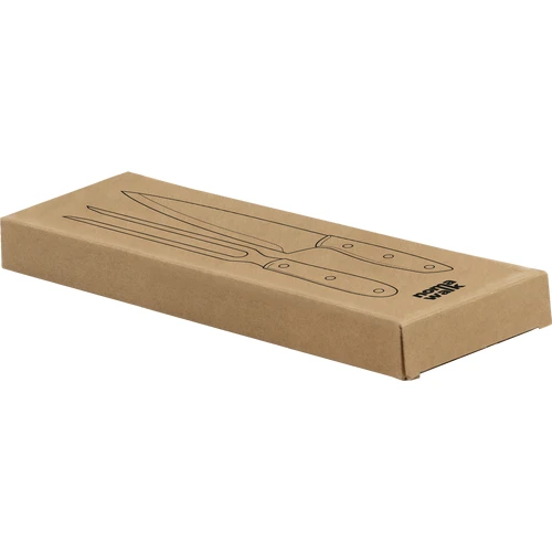 34 x 9,7 x 2,5 cm (caja) . Acero inoxidable 420 y madera. Set de 2 utensilios: tenedor y cuchillo de 31,4 cm, ambos con mango de madera. Presentación en caja de regalo Kraft.