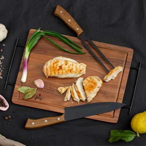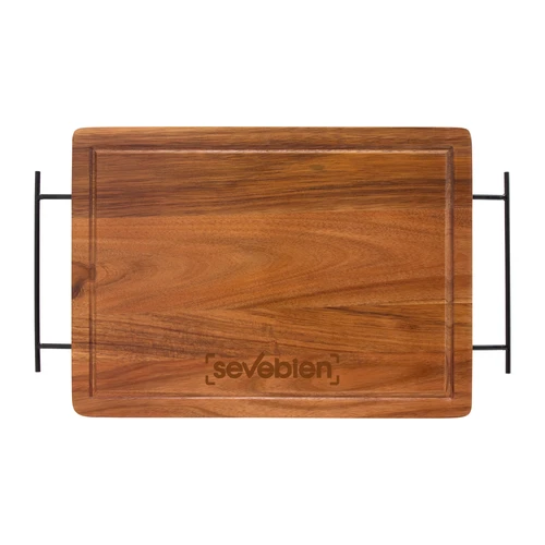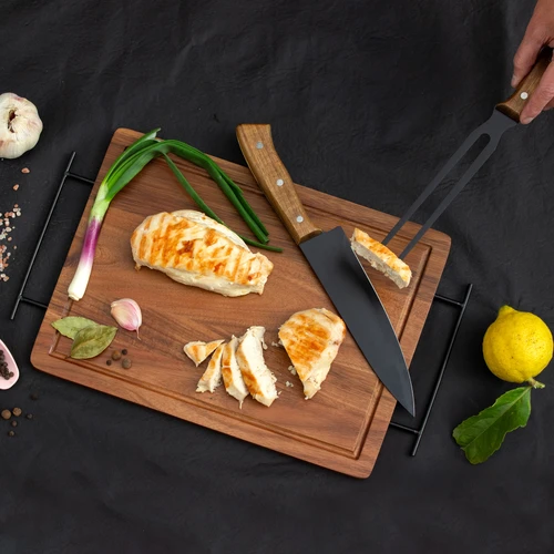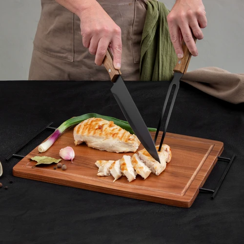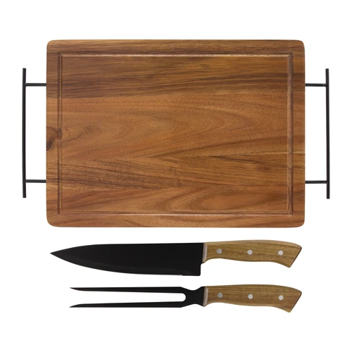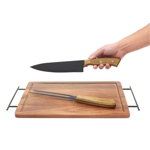43 x 26 x 1,2 cm. Madera y acero inoxidable. Set de asado. Tabla de corte / Bandeja de madera de acacia con asa de ambos lados de acero de carbono. Contiene 2 utensilios de acero inoxidable 420 y mangos de madera de acacia: Cuchillo de 33,5 cm y 150 g, y Tenedor de 31,5 cm y 115 g. Cada utensilio y el set completo se presentan en caja de regalo kraft.