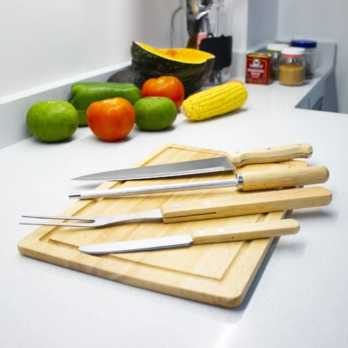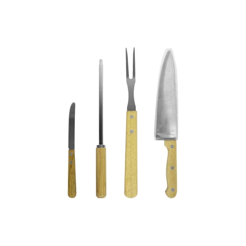 23 x 35,5 x 4,2 cm. Poliéster 300D, bambú y acero inoxidable. Set de asado de 5 piezas: Tabla de bambú 32,5 x 21,5 x 1,1 cm. Tenedor asador, cuchilla, cuchillo y chaira para afilar, todos con mango de madera barnizados. Presentación en caja de regalo.