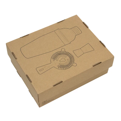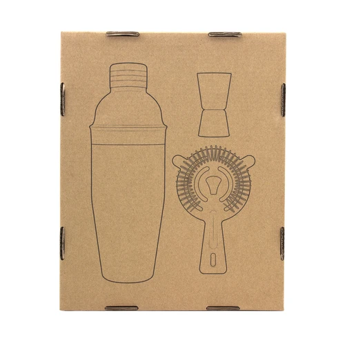 Acero inoxidable. Bartender Kit de tres piezas: Coctelera (Shaker) Ø 8 x 23,8 cm. Capacidad 600 ml. Vaso mezclador en acero 202 con acabado negro mate y tapa con colador incorporado. Medidor (Jigger) Ø 3,7 x 6,9 cm. Capacidad 30/15 ml. (1 y 1/2 oz) en acero 202. Colador oruga/gusanillo 14 x 9,5 cm. en acero 430. Presentacion en caja de regalo kraft.