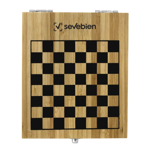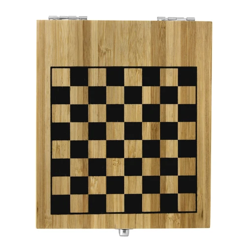 Diversión clásica en un solo setSet de entretenimiento. Incluye: 1 juego de cartas de póker plastificadas, 5 dados de madera y 32 piezas de ajedrez. Caja contenedora en bambú con bases encastrables en eva. Tablero de ajedrez impreso en la tapa. Apertura con bisagras y cierre con traba metálicos.Medidas: 14,2 x 17 x 4,6 cm.