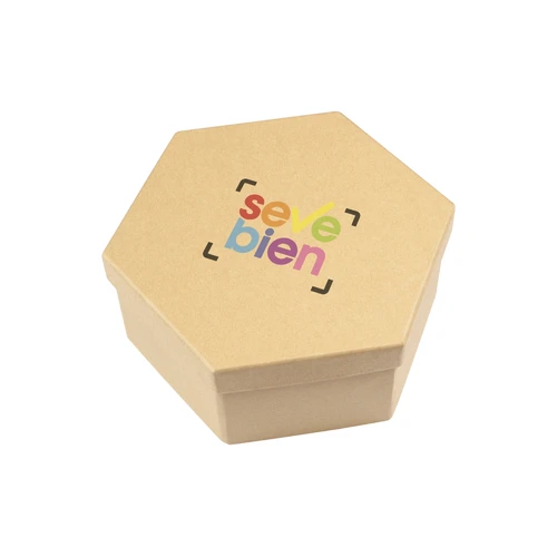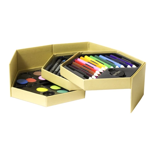 16 x 8 cm. (cerrado) 44 x 8 cm. (abierto). Cartón. Set de pinturas en forma de hexágono. 12 lapices de colores, 1 sacapuntas, 12 crayones, 1 goma de borrar, 12 acuarelas y 1 pincel.