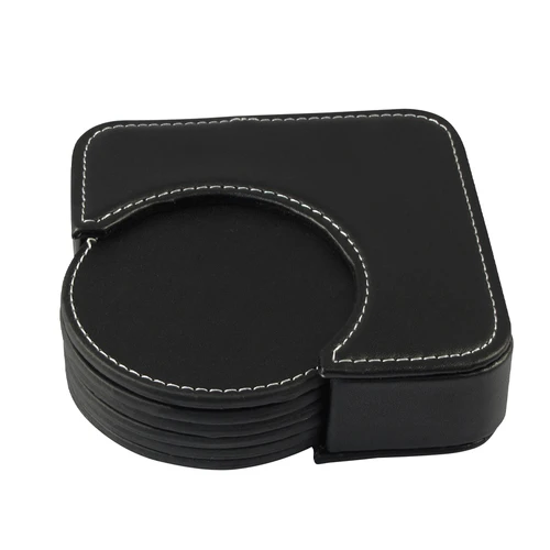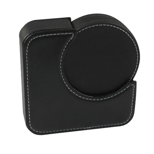 Set de 6 posavasos redondos, en PU negro. Incluye contenedor cuadrado. Infaltable en tu bar.