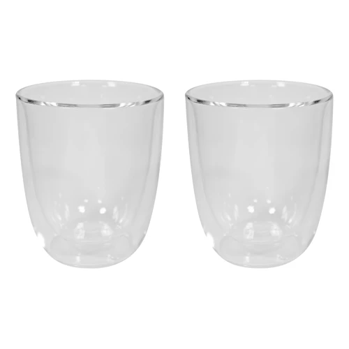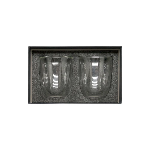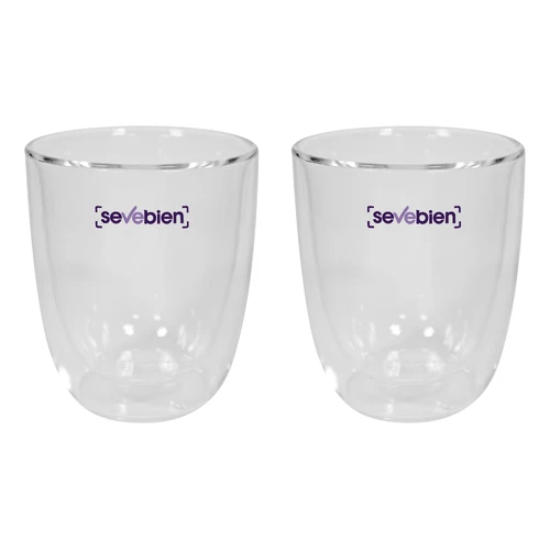 Ø 8,3 x 10 cm. Capacidad 280 ml cada vaso. Vidrio. Set de vasos doble pared. Apto para bebidas frías y calientes. Presentación en caja de regalo.