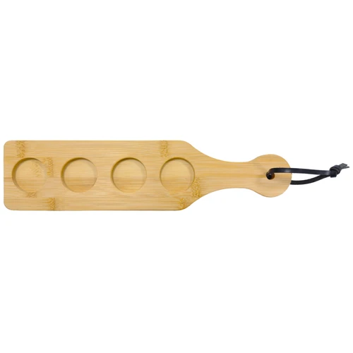 Celebra con estilo.Set de 4 vasos tequileros de Ø 5 x 6 cm. en bandeja de bambú con tira simil cuero.Medidas: 33 x 8 x 1 cm.