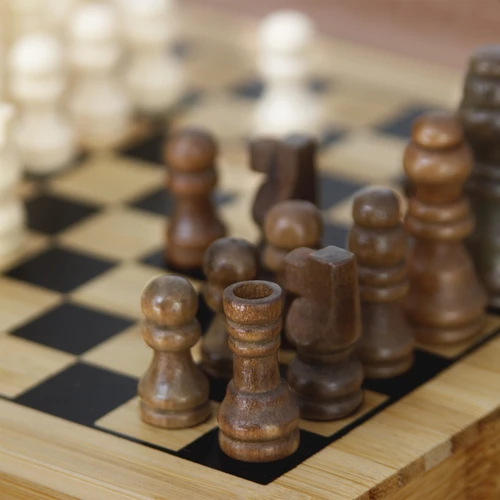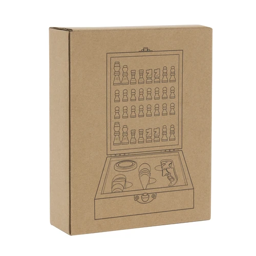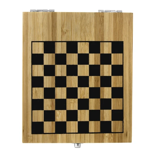 17 x 14 x 4,5 cm. Bambú, madera y acero inoxidable. Set de vino de 4 piezas (sacacorchos, anillo antigoteo, tapón y vertedor) con juego de ajedrez. Caja contenedora en bambú con piezas de ajedrez en madera. Abridor de acero inoxidable 420. Anillo de acero inoxidable 210. Tapón con aleación de zinc y aluminio. Vertedor de acero inoxidable 201 + silicona. Presentación en caja de regalo kraft.