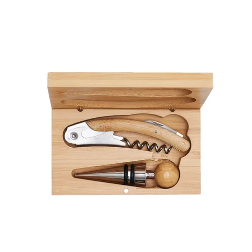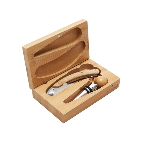 Set de vinos en caja de bamboo de dos elementos. Posee: Sacacorchos dos tiempos y tapón, realizado en acero inoxidable. Medidas de la caja: 13 x 8 x 3,2 cm. La Baule.