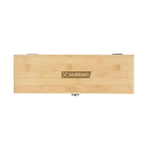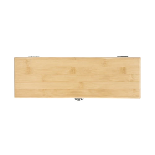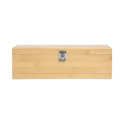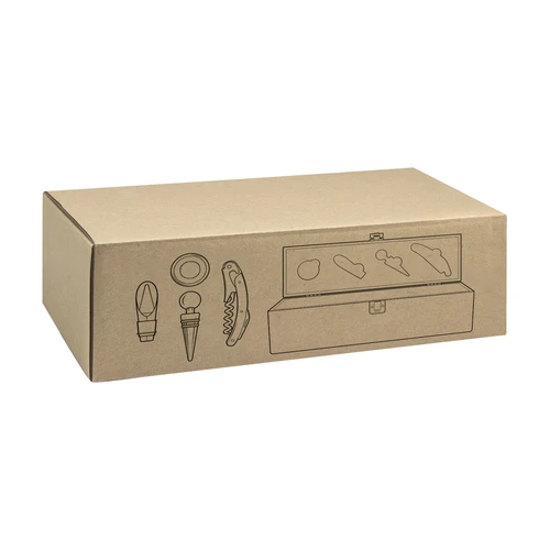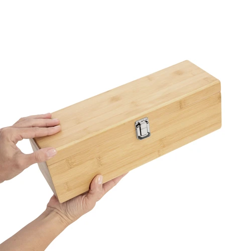 Clásico y completo. El obsequio idealSet de vino. Caja de bambú portabotellas con cierre metálico. Bandeja de eva con set de 4 accesorios: sacacorchos, anillo antigoteo, tapón y vertedor. Medidas: 36 x 11,5 x 11,5 cm.