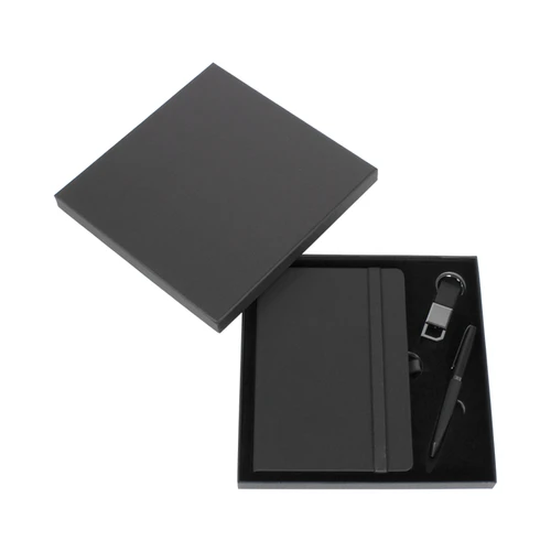 Set Ejecutivo de Escritorio. Incluye cuaderno negro tapa dura texturada, tamaño A5 de 14.6 x 21 . 1.5 cm con 96 hojas lineadas amarillo claro, cierre elasticado negro, llavero ejecutivo con mosquetón, anillo y cuerpo metálico cromado y cinta de PU texturado y finalmente Bolígrafo ejecutivo metálico, cuerpo negro opaco y escritura azul. Presentación en elegante caja con tapa, de cartón piedra texturado negro, con interior cama de terciopelo negro, con troquelados para cada elemento. Un gran regalo para nivel ejecutivo.