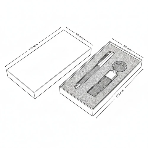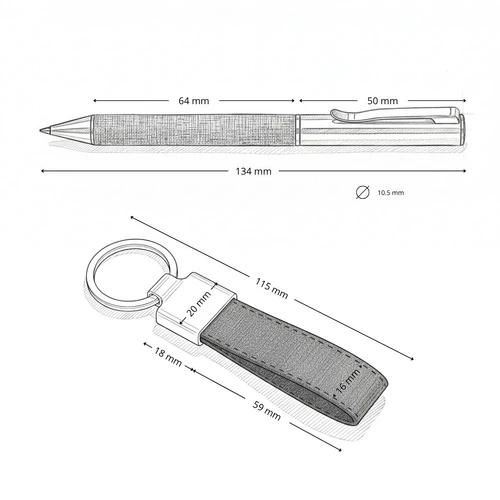 KALANI combina funcionalidad y diseño en un set compuesto por bolígrafo metálico y llavero revestidos en tela RPET gris. Cada elemento está cuidadosamente empacado en una caja negra que proyecta sobriedad y profesionalismo. El RPET proviene de botellas recicladas, dándole una segunda vida al plástico y reforzando el mensaje de cambio desde lo cotidiano. Coloca tu logo y convierte este set en una expresión tangible del compromiso de tu marca con un futuro responsable.