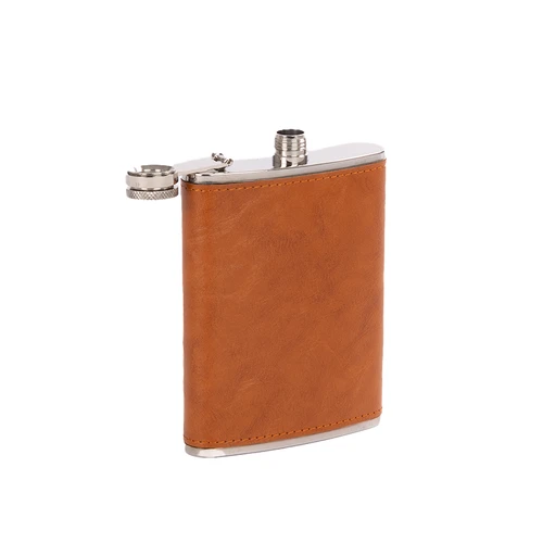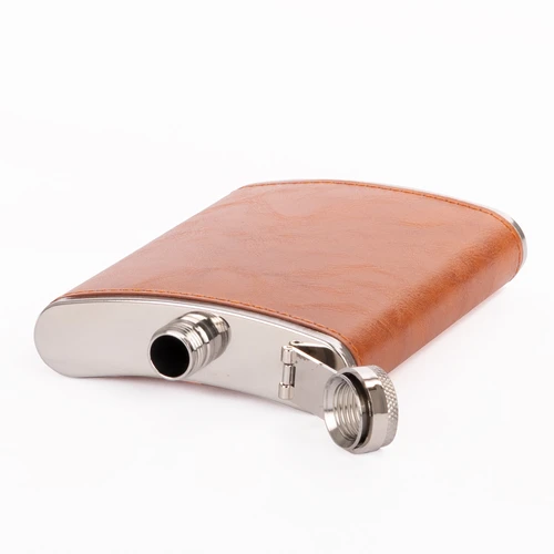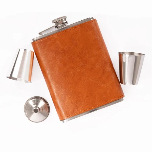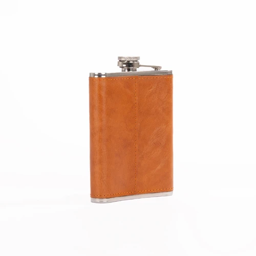 Set Petaca Licorera con cubierta de eco-cuero café claro (color caramelo) + 2 vasitos + 1 embudo de Acero Inoxidable SS304, modelo "OXFORD". Capacidad Petaca 8 oz (237 ml). Presentación en elegante estuche de cartón forrado negro con tapa. Interior cama aterciopelada negra.