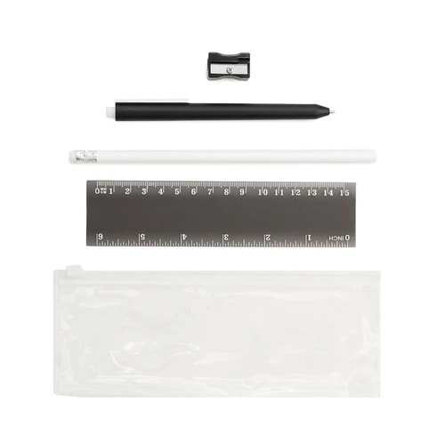 Cartuchera plástica transparente con cierre. Incluye: Lápiz (Tinta Azul), lapiz grafito y regla. Colores: negro, rojo y azul. Medidas: 8 x 20 x 1,2 cm.