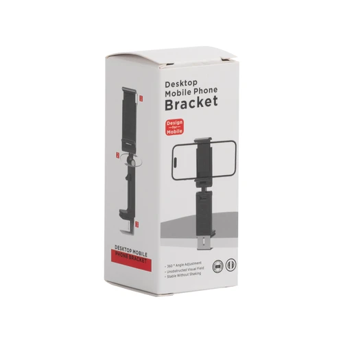 Soporte Porta-Celular con sistema de sujeción a cubierta de hasta 4cm de grosor. Giro 360° hacia arriba/abajo y hacia los costados. Sujeción de celular retráctil hasta 9cm. Presentación en bolsa pp + caja de regalo impresa a todo color.