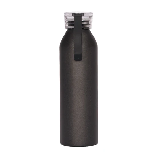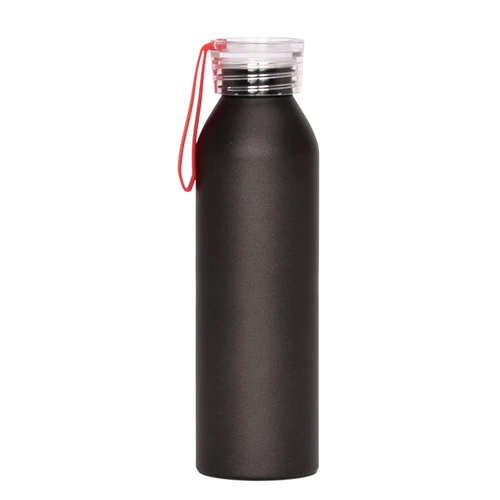 Sport Bottle botella metálica de Aluminio modelo "MARATHON", con tapa rosca de plástico PP translúcido, banda colgante de silicona y anillo interior anti-derrame. Producto BPA FREE, para el contacto con líquidos y alimentos. Capacidad 600ml. Presentación en bolsa plástico burbuja + caja de regalo de cartón lacado color negro. IMPORTANTE: esta botella NO es térmica, apta sólo para líquidos fríos.