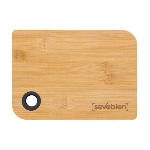24,7 x 17,5 x 1 cm. Bambú y Silicona . Tabla de bambú con anillo de silicona color negro para colgar y trasladar. Tabla para cortar y presentar diferentes quesos, fiambres y embutidos. Presentación en caja de regalo kraft.