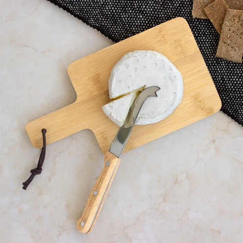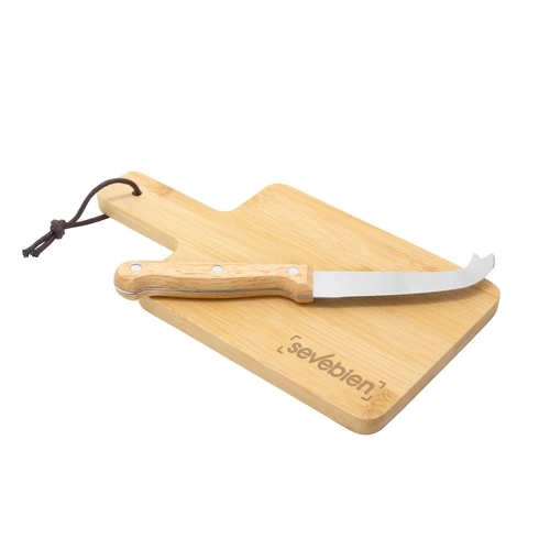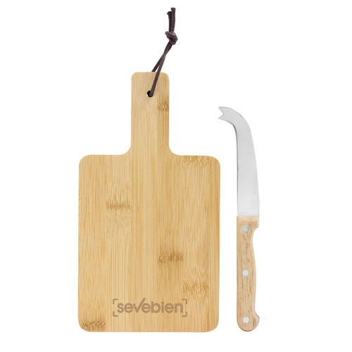 22 x 12 x 1,2 cm. Bambú + Acero inoxidable. Set de tabla de corte para quesos y cuchillo. Tabla con recubrimiento de aceite vegetal y correa en el mango. Cuchillo de 19,5 cm de largo, de acero inoxidable 420 y mango de madera . Presentación en caja de regalo kraft.