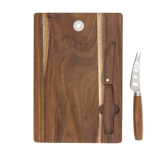 24,5 x 17,2 x 1,5 cm. Madera y acero inoxidable. Tabla para quesos. Tabla de madera de acacia con imán para fijar el cuchillo y anillo de acero inoxidable para colgar. Cuchillo con agujeros ideal para quesos blandos a semiduros, de 17,2 cm., hoja de acero inoxidable 420 y mango de madera de acacia. Presentación en caja de regalo kraft.