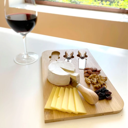 29,8 x 18,7 x 1,2 cm. Bambú y Acero inoxidable . Tabla de bambú con set de 3 utensilios de acero inoxidable 210 con mango de madera: 2 cuchillos y 1 tenedor. Tabla para cortar y presentar diferentes quesos acompañada de un buen vino tinto en tus próximas reuniones. Presentación en caja de regalo.