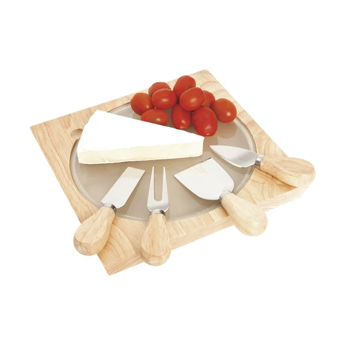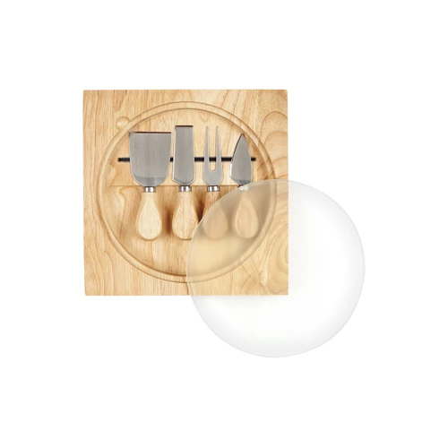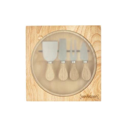 23 x 23 x 2,5 cm. Madera. Tabla para quesos. En la parte interna contiene imán que sostiene 4 utensilios de acero inoxidable y mango de madera. Tabla circular de vidrio templado Ø 20 cm. Presentación en caja de regalo.
